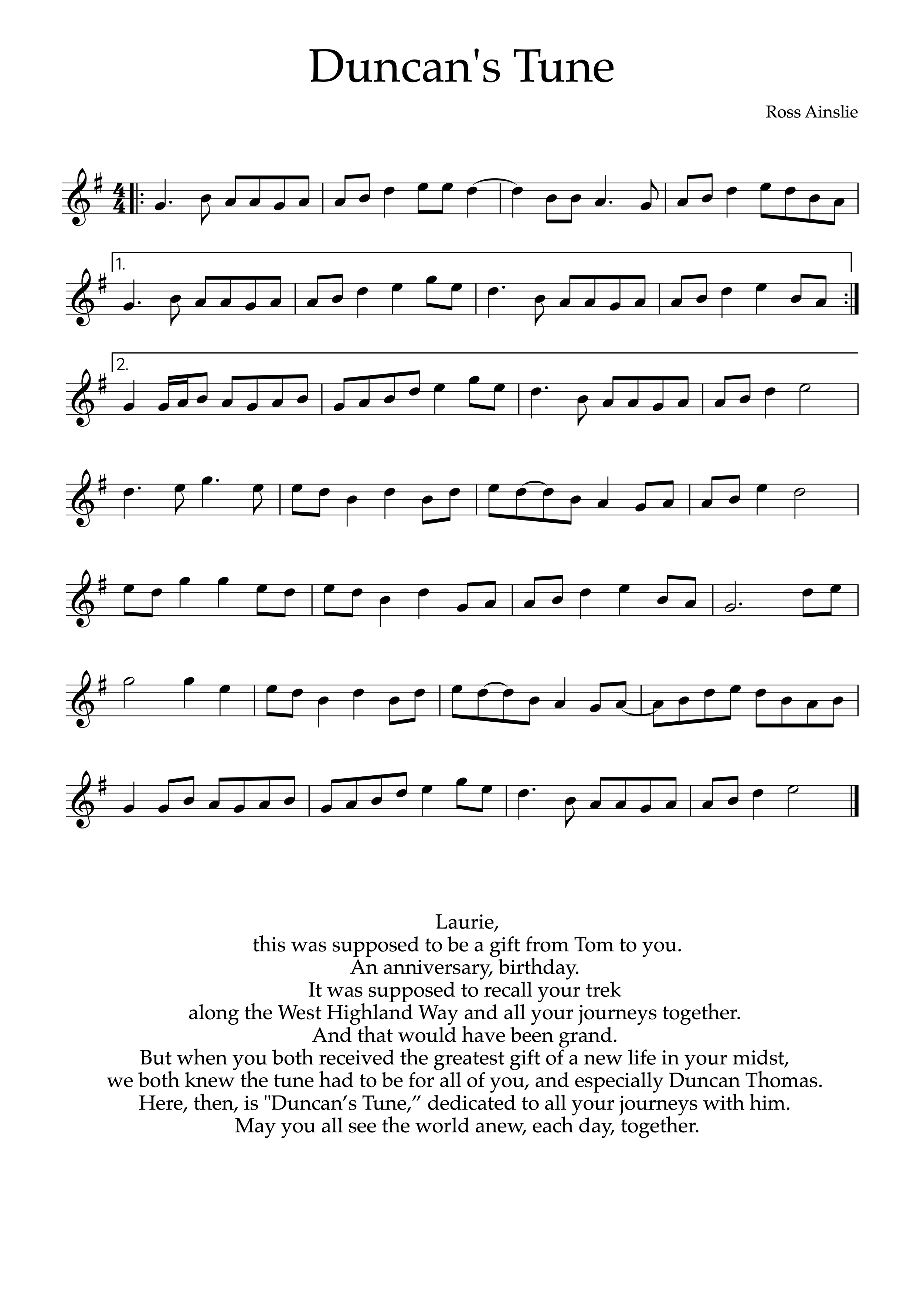 What began as an anniversary gift to remember our 2023 West Highland Way walk became a double gift upon the birth of our first grandchild, Duncan. So, “Duncan’s Tune,” in which the world’s finest piper captures the adventuring spirit of both in his melody and arrangement. Imagine a thing timeless as it marks the time. Thanks to Ross’ genius, “Duncan’s Tune” is.